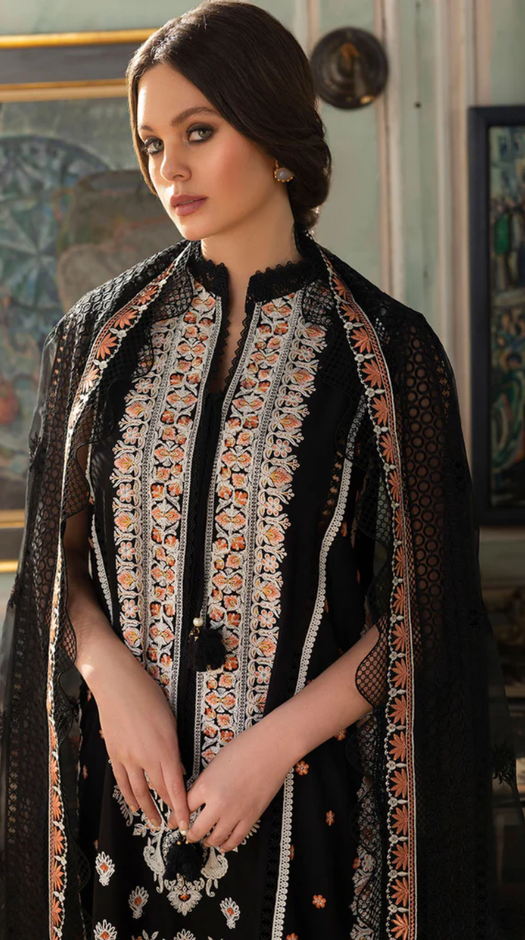 Embroidered Chiffon Front. Embroidered Chiffon Side Panels. Embroidered Chiffon Back. Embroidered Chiffon Sleeves. Embroidered Chiffon Dupatta. Embroidered Organza Border for Front and Back. Embroidered Organza Border for Sleeves. Dyed Trouser.