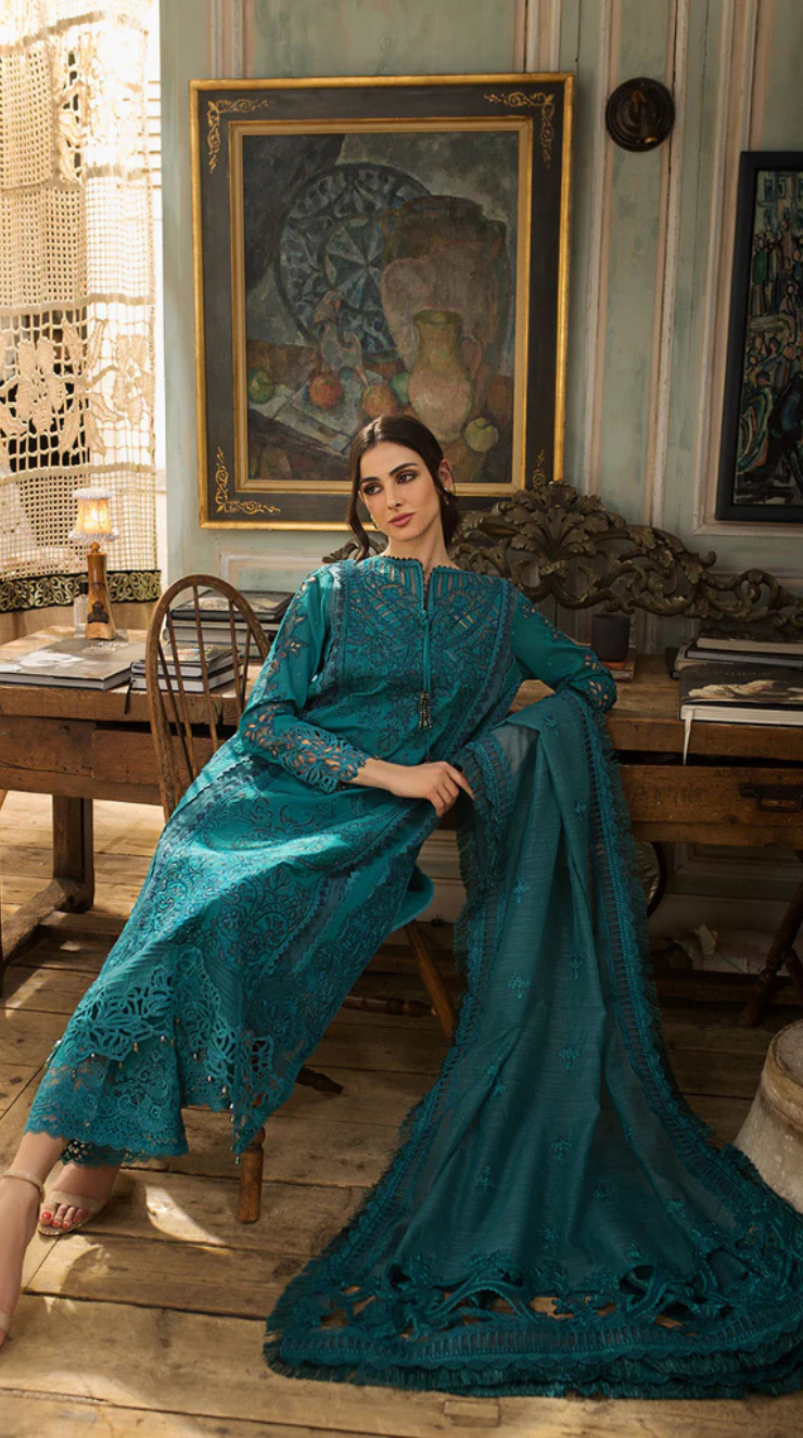 Embroidered Chiffon Front. Embroidered Chiffon Side Panels. Embroidered Chiffon Back. Embroidered Chiffon Sleeves. Embroidered Chiffon Dupatta. Embroidered Organza Border for Front and Back. Embroidered Organza Border for Sleeves. Dyed Trouser.