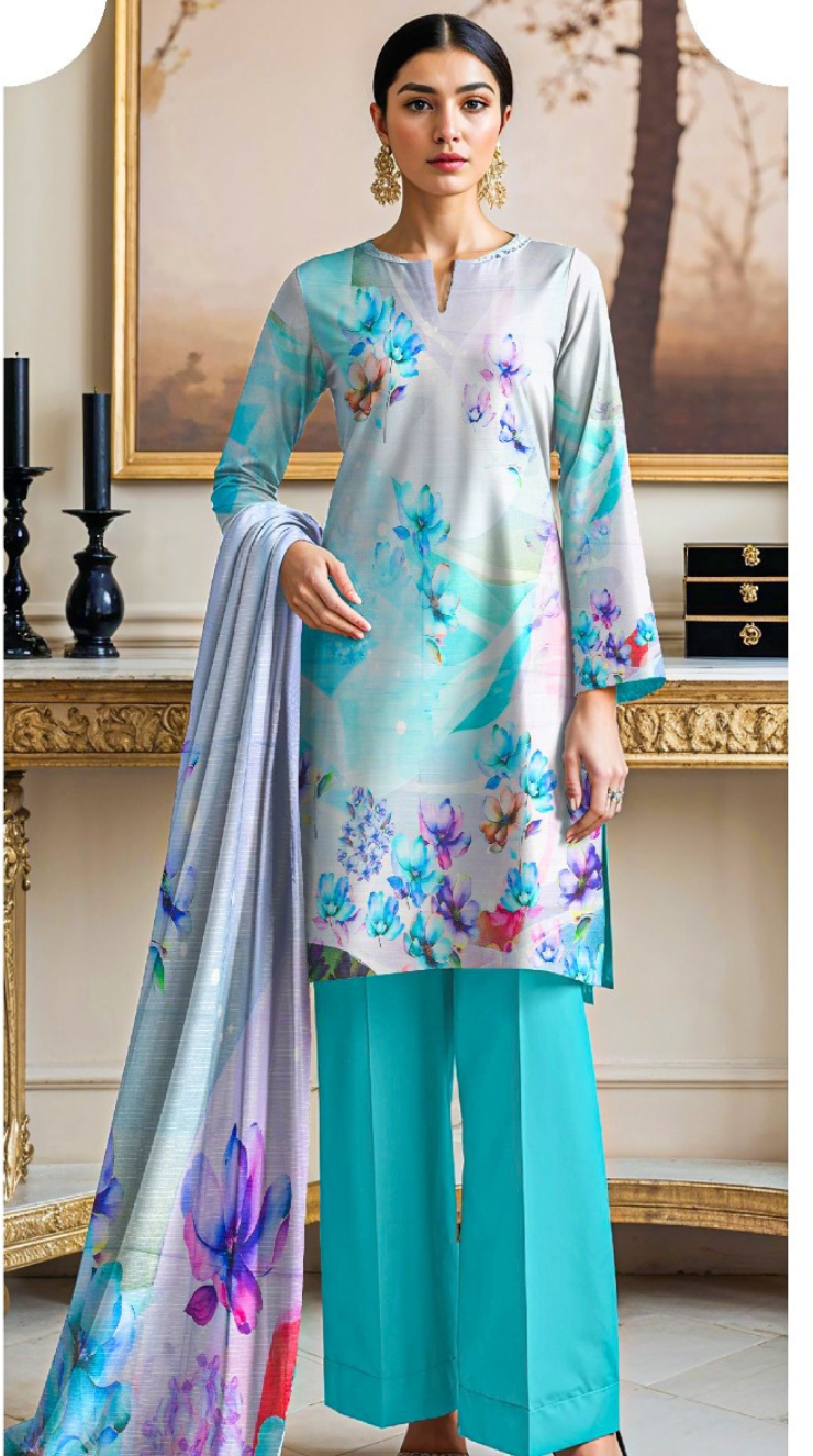 Embroidered Chiffon Front. Embroidered Chiffon Side Panels. Embroidered Chiffon Back. Embroidered Chiffon Sleeves. Embroidered Chiffon Dupatta. Embroidered Organza Border for Front and Back. Embroidered Organza Border for Sleeves. Dyed Trouser.
