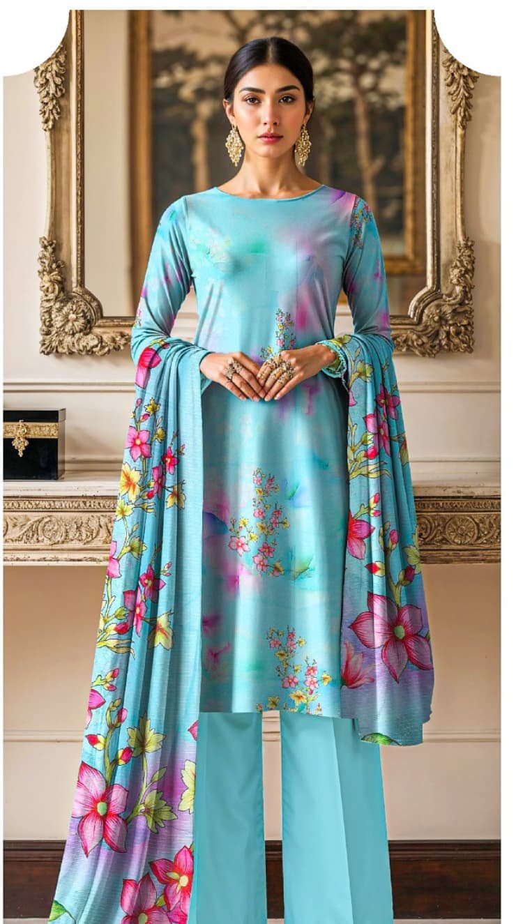Embroidered Chiffon Front. Embroidered Chiffon Side Panels. Embroidered Chiffon Back. Embroidered Chiffon Sleeves. Embroidered Chiffon Dupatta. Embroidered Organza Border for Front and Back. Embroidered Organza Border for Sleeves. Dyed Trouser.