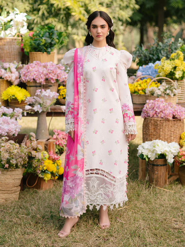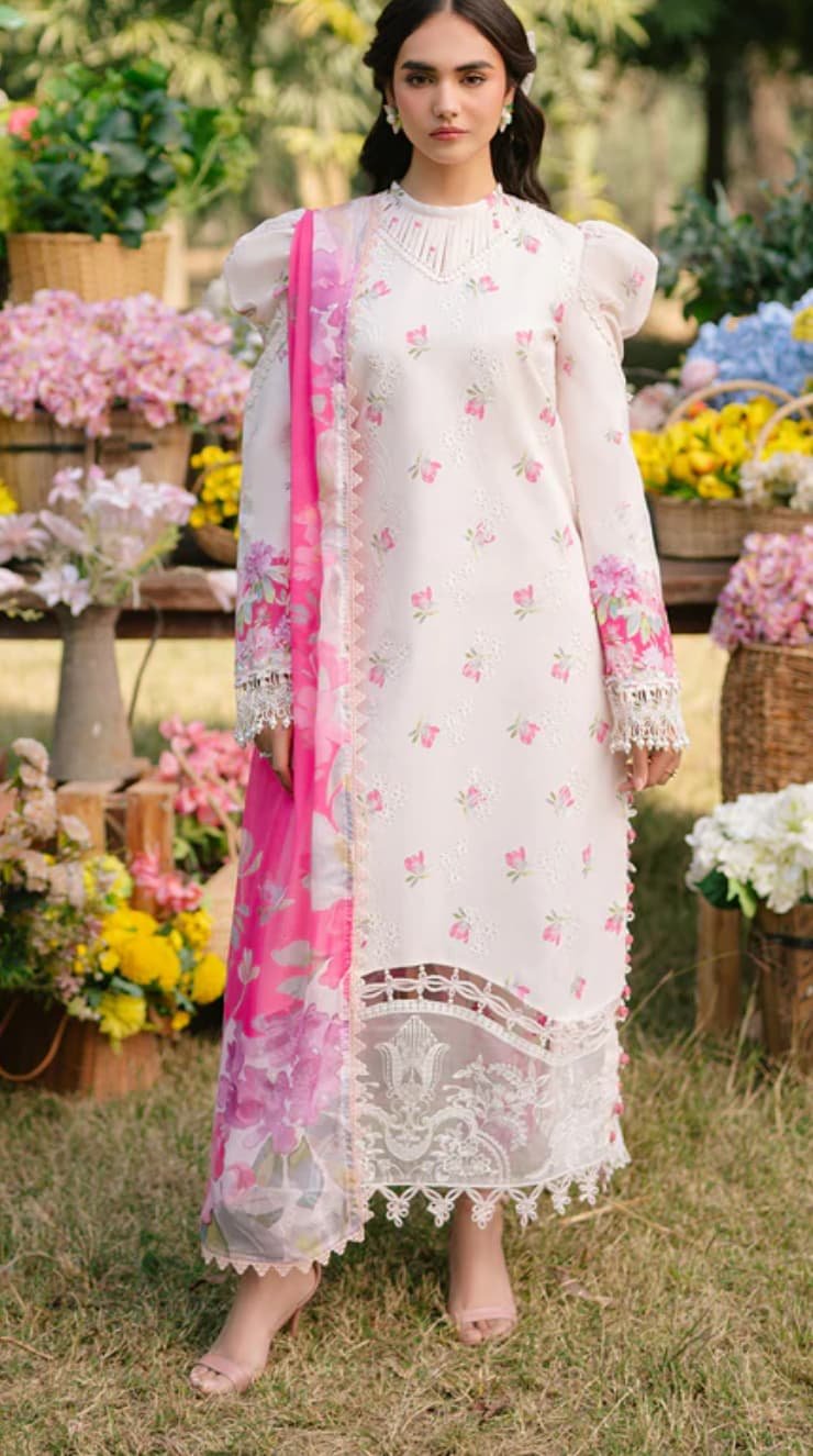 Embroidered Chiffon Front. Embroidered Chiffon Back. Embroidered Chiffon Sleeves. Embroidered Chiffon Dupatta. Embroidered Organza Dupatta Pallu. Embroidered Organza Neck Patch. Embroidered Organza Border for Front and Back. Embroidered Organza Border for Sleeves. Dyed Trouser.