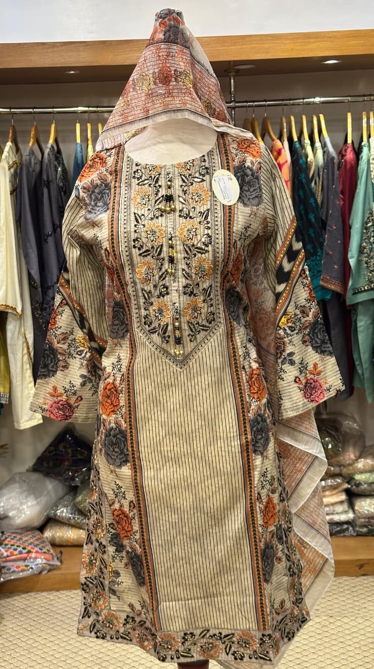 Embroidered Chiffon Front. Embroidered Chiffon Side Panels. Embroidered Chiffon Back. Embroidered Chiffon Sleeves. Embroidered Chiffon Dupatta. Embroidered Organza Border for Front and Back. Embroidered Organza Border for Sleeves. Dyed Trouser.