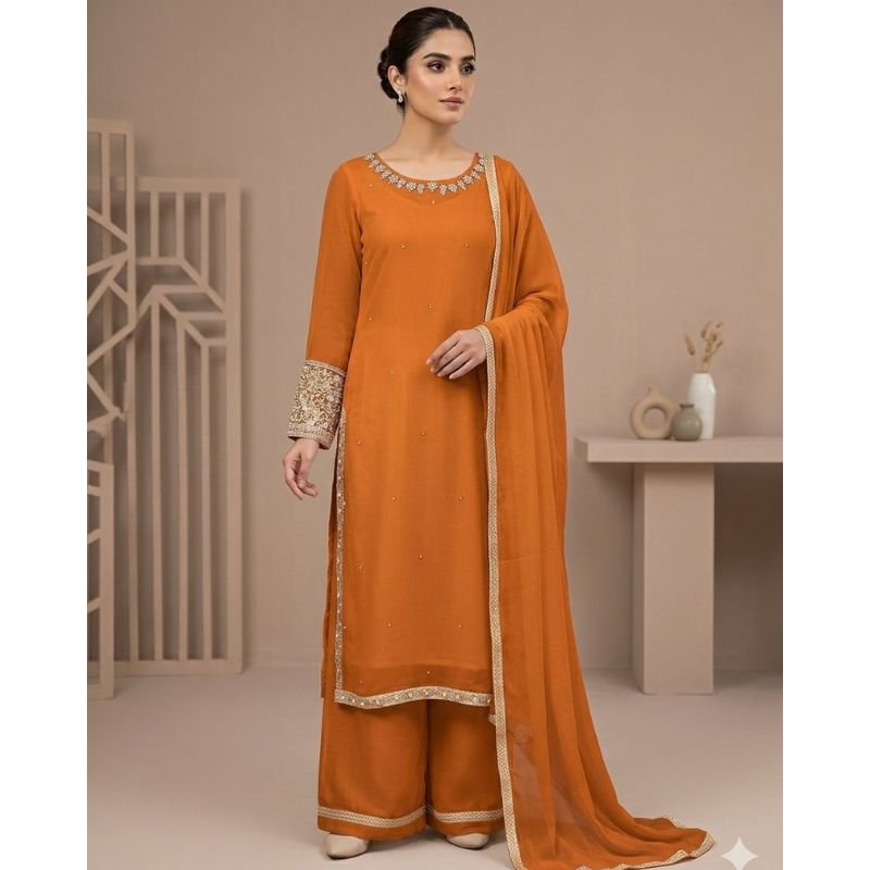 A mesmerizing blend of traditional craftsmanship and contemporary grace. This burnt orange ensemble is crafted from premium georgette chiffon, featuring a straight-cut shirt with an intricately hand-worked neckline and statement cuffs. Paired with tonal wide-leg trousers and a delicate bordered dupatta, this outfit is a perfect choice for festive gatherings, weddings, and formal dinners.