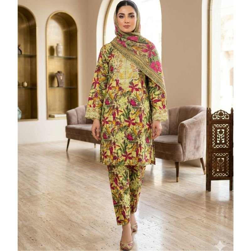 Step into the season with our “Botanical Bloom” set, featuring an intricate fusion of lush greenery and striking magenta florals. Crafted from premium, breathable lawn fabric, this outfit offers a seamless “all-over” print look that is both slimming and sophisticated. The ensemble is elevated by a matching digitally printed dupatta with a structured geometric border, making it an ideal choice for brunch dates, office wear, or festive daytime gatherings.
