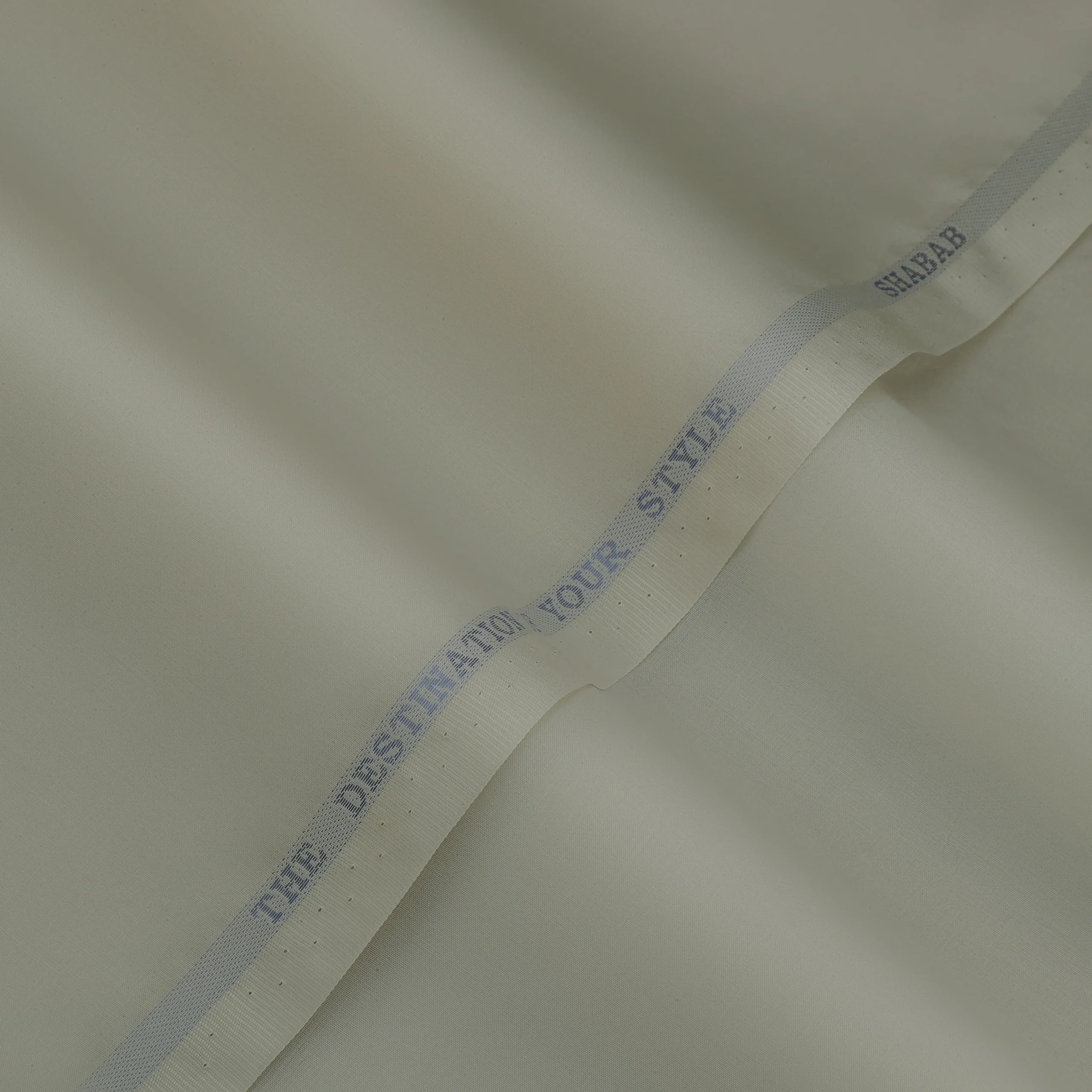 This is a premium cotton fabric with a smooth, finely woven texture and a soft, refined finish. It offers excellent breathability and comfort, giving a clean and elegant appearance. The fabric features a subtle sheen and a neatly finished selvedge with branded detailing, reflecting high quality and fine craftsmanship. Its durable structure and polished look make it suitable for those who value comfort and superior fabric quality.
