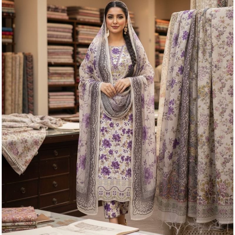 The look is anchored by an exceptionally intricate, dual-toned dupatta that mirrors the floral pattern and features a sophisticated, wide border detail. With its balanced color palette and clean, tailored silhouette, this ready-to-wear set offers a polished, timeless appeal suitable for both festive occasions and daytime elegance.